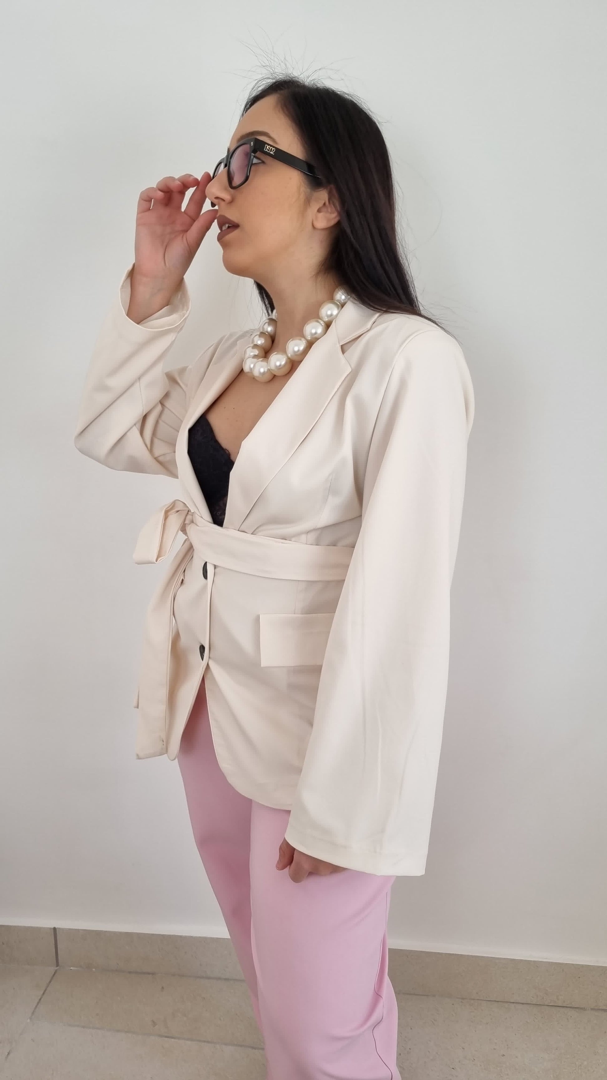 Blazer oversize con cintura. Indossabile con o senza cintura.Maniche lunghe. Tasche sul davanti. Fodera interna. Cintura nello stesso tessuto. Chiusura frontale incrociata con bottoni.