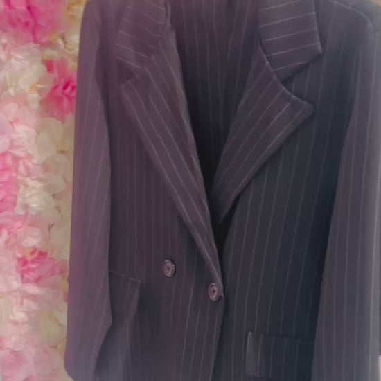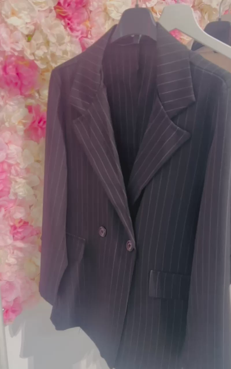 Tailleur gessato. Vestibilità over, pantalone con elastico in vita e giacca con bottone.